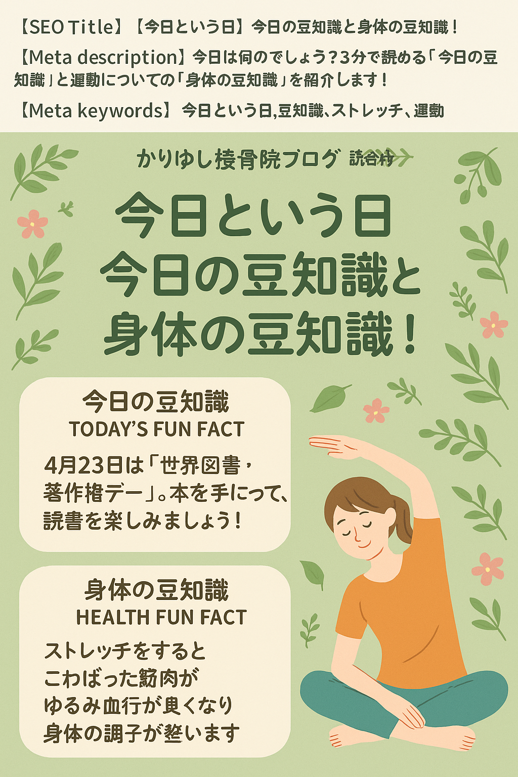 「世界本の日」にちなんで、今日は読書とストレッチで心も体もリフレッシュしてみてはいかがでしょうか?